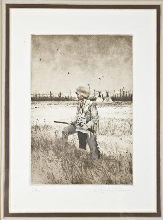 Original hand-pulled etching by noted western artist Michael Coleman of indian with musket in snow showing traditional dress with Teepees in background. Numbered 2 of 25, and hand signed. Approx. 9”h by 6”w (artwork).Along with hand-signed book entitled "Under Eagle’s Wings" portraying the artwork of Michael Coleman by Peter Hasserick, former curator of the Buffalo Bill Museum and well known author of western art. Est: $900 –1800