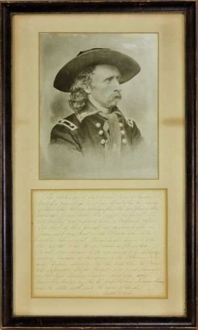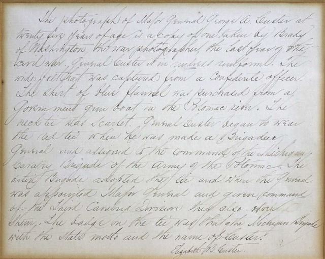 Original hand written documentuniform at age 25 by his wife Elizabeth B. Custer. "The photograph of Major General George A. Custer at twenty five years of age is a copy of one taken by Brady of Washington, the warphotographer, the last year of the civil war. General Custer is in undress uniform. The wide felt hat was captured from a confederate officer. The shirt of blue flannel was purchased from a government gun boat in thePotomac river. The neck tie was scarlet. General Custer began to wear the red tie when he was made a Brigadier General and assigned to the command of the Michigan Cavalry Brigade of the Army of the Potomac. Theentire brigade adopted the tie and when the General was appointed Major General and given command of the Third Cavalry Division they also wore them. The badge on the tie was that of the Michigan Brigade with the state motto and the name of Custer". Signed Elizabeth B. Custer. From the Gary Helin collection. Est. 1500-2500
