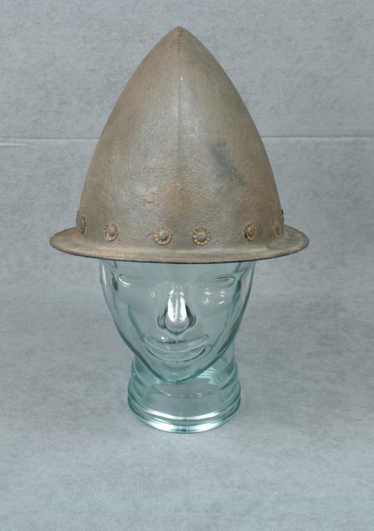 Original iron Spanish Cabisette helmet, circa  1580’s to 1650’s, in overall good condition  showing a heavy dark patina with all exterior  rivets intact, several interior rivet  backings are missing; an honest old helmet in untouched condition.  Est.:  $150-$300.