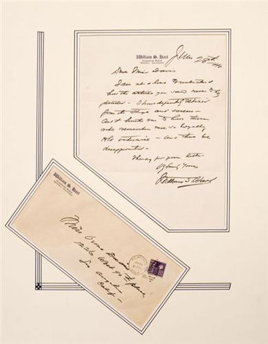 Original Letter from Wm. S. Hart to Miss Davis. Dated June 28, 1940, envelope included. Original Hart signature. New frame. (est $200-300)