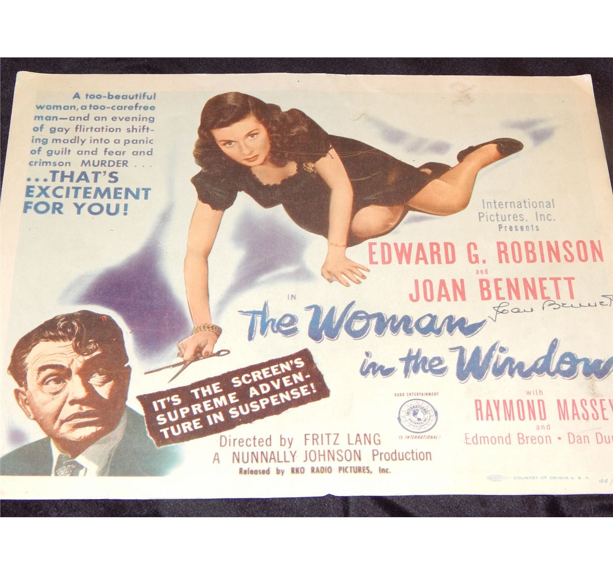 Original lobby card for the 1944 Woman in the Window signed by Joan Bennett