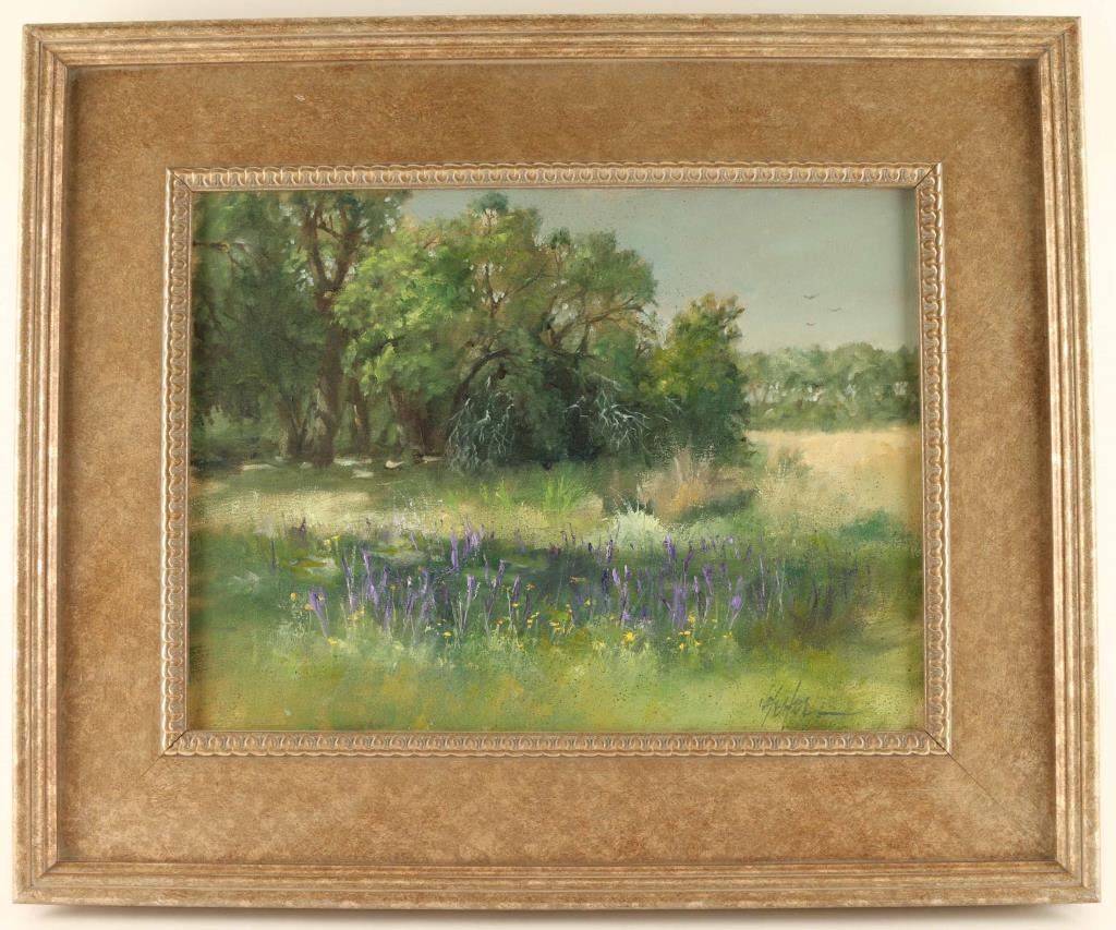 by V. Hester depicts a grassy landscape, hand signed, measures 15" by 11 1/2" .