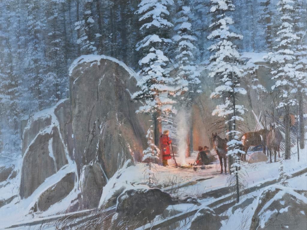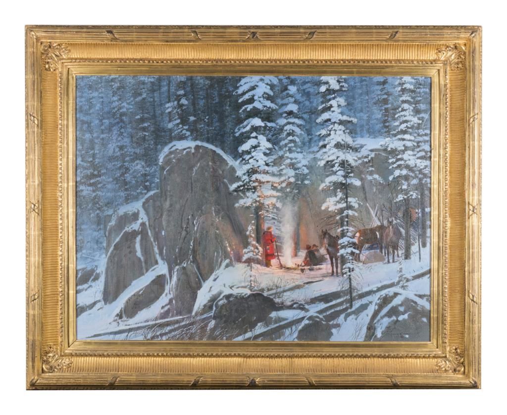 Original oil on board entitled "Midnight Campfire" signed by Michael Coleman measuring approximately 29" x 39"." Michael Coleman is an award winning American artist known for his wildlife, Native American and Western theme works. His paintingsand bronzes are prized by collectors and displayed at many museums and public facilities including the Buffalo Bill Historical Center in Cody, WY. A major work that would retail $30,000-$40,000 at major galleries. A copy of his recent bookentitled “On Eagles Wings” is also included. Est.: $10,000-$20,000