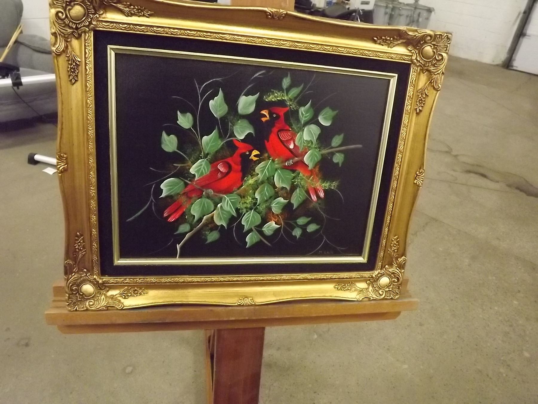Original oil on canvas Pair of Cardinals. Signed by M. Lak Ornate gilded frame (O)