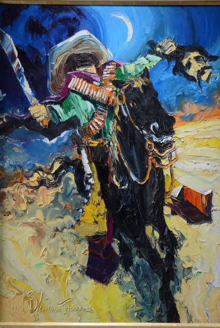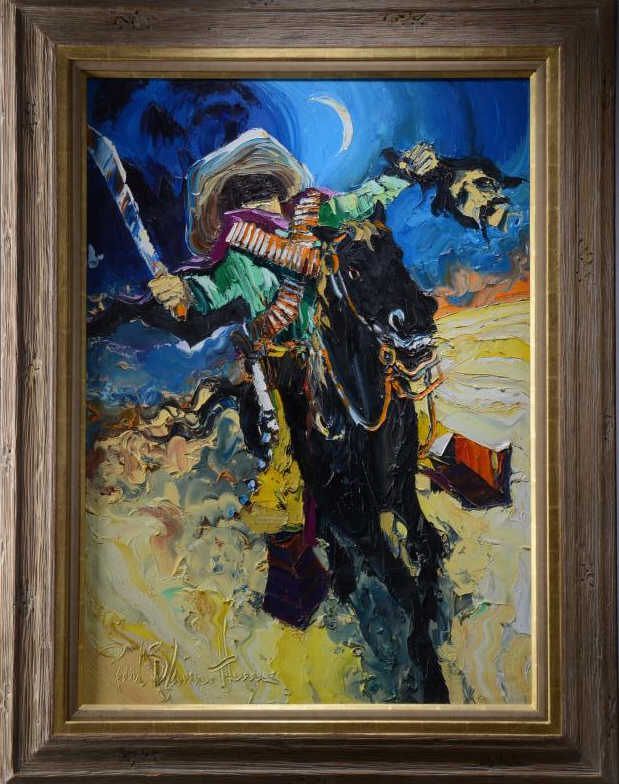 Original oil on canvas by Paul Blaine Henrie, entitled "Joaquin Murietta", one of a series done for the book entitled "Legendary Outlaws of The West" by Brad Williams (refer Lot 1288). The image measures 42" high x 30" wide, all in the series are framed to match. Est.: $ 750-$1,500