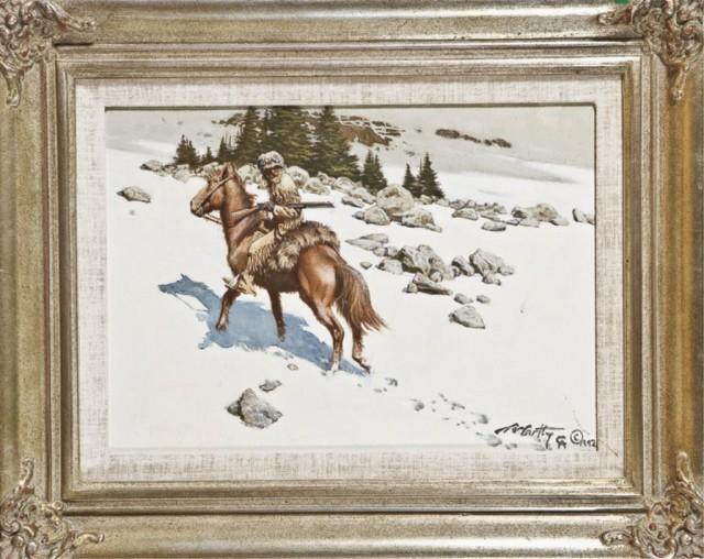 Original oil on canvas entitled In the Open" by Frank C. McCarthy (1924 - 2002). Approx. 10” by 14”. Shows trapper in the snow. This C.A. artist has been extremely popular with collectors since the 1970's. From the Robert Petersen Collection." Est: $4,000 - $8,000