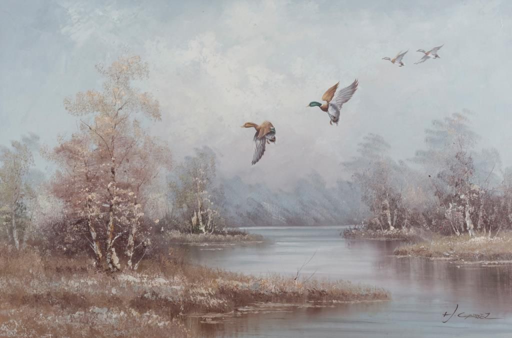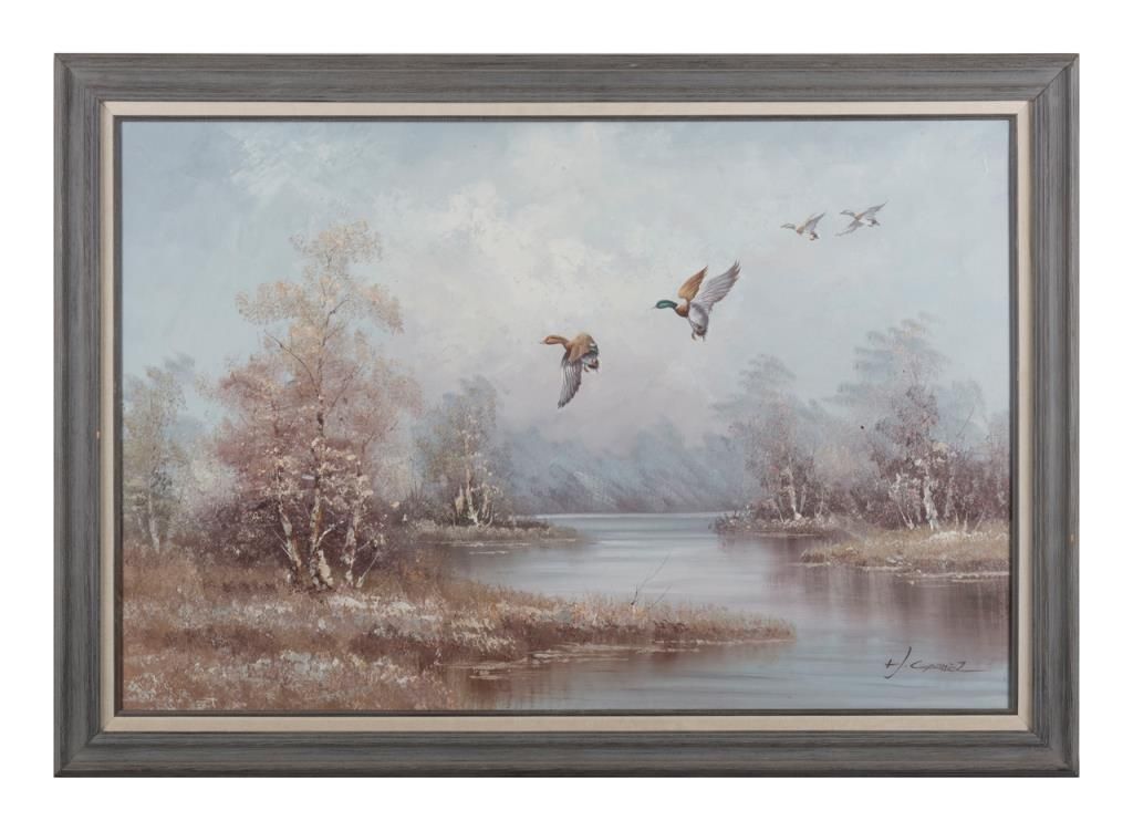Original oil on canvas of mallards coming in for a landing, nicely framed, signed by what appears to be “H. Coppel”, approx. 29” x 41”. Est.: $200-$400.