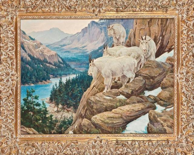 Original oil on canvas showing mountain goats with river and campground below. Ralph Crosby Smith (1911-1965), noted California artist. Approx. 21-1/2 by 28-1/2” (image). One small area of damage approx. 8mm circular impression which is starting to go through canvas in the top right corner, otherwise very good. Needs slight conservation. Period frame is good with some slight damage. From the Robert Petersen Collection. Est: $1,000 - $2,000