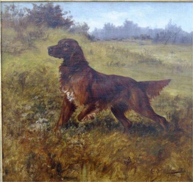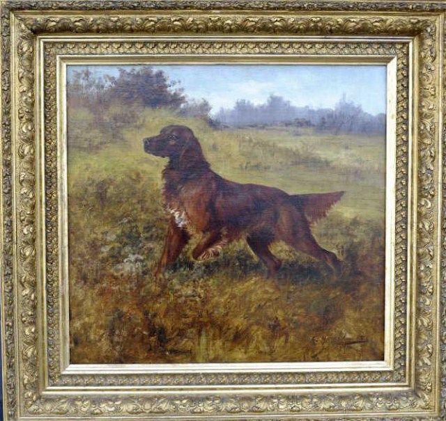 Original oil on canvas showing pointing setter signed lower right Gustave Muss. Arnott. The painting measures approximately 20-1/2”x21” and in period framed and ornate pre-war frame. The condition is nearexcellent with no problems. Appears to have been freshly restored and backed. Considered to be one of the very best European Wildlife Artists of the early 20th century this was Margie Petersen’s favorite dog painting andwe would date the painting about 1915. From the Robert E. Petersen Estate. Est.; $6,000-$12,000