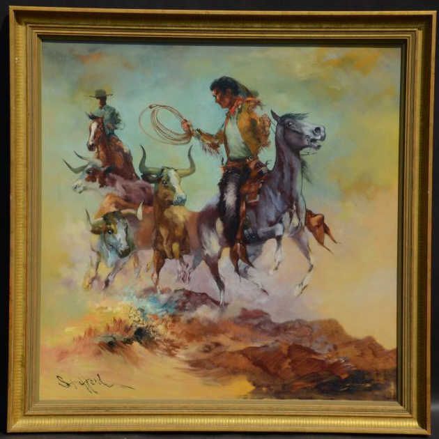Original oil on canvas signed L.L. Spafford measuring approximately 56”x36”. Roy Spafford worked in Southern California up into the 1970’s and his works were favored by the owner of the Saddleback Inn of Santa Ana andother Western enthusiasts. He mixed modern and traditional styles and took some bold attempts at color influenced by W.R. Leigh. His career was derailed by personal problems by the late 1970’s and we rarely see hisworks offered. Nicely framed. Est.: $400-$800.