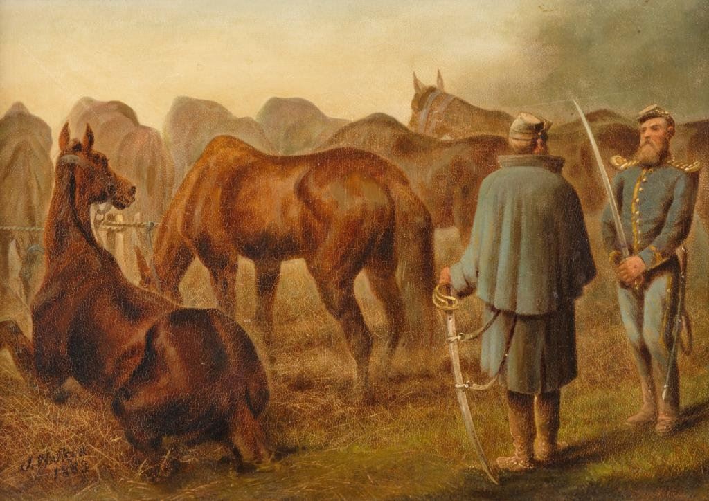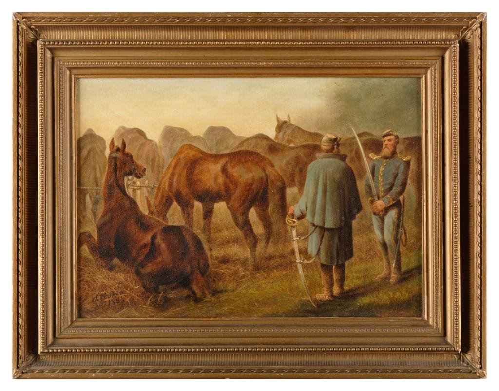 Original oil on canvas signed lower left “J. Walker 1883”. Portrays 2 Cavalry men with horses and sabers. Approximately 15 ½” x 12 ½” in period frame. Some minor cracking and aging. From Hugh Hayes, famous Stockton are collector’s estate. Walker was a highly regarded painter whose work hangs in the Capitol rotunda and major institutions. His painting of Vaquero in California topped $100,000. Est.:$2500-$5000+ Opening bid $2500