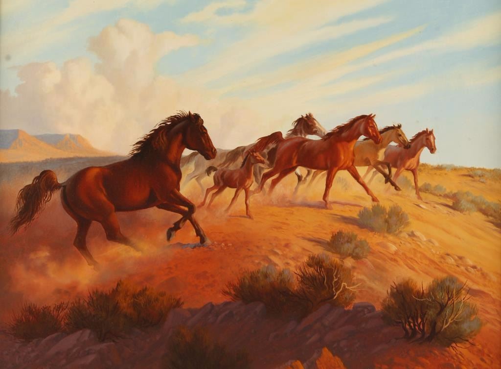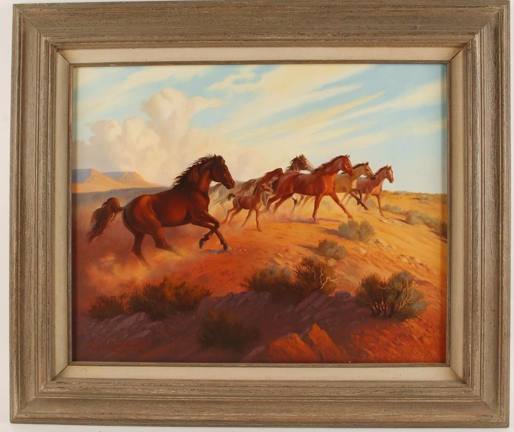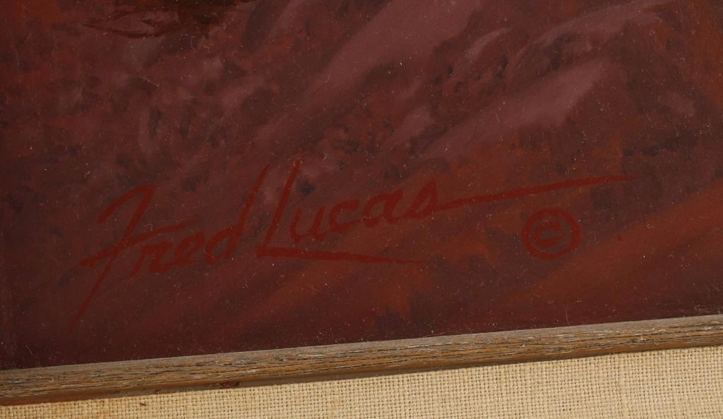 by noted Arizona artist Fred Lucus. Depicting running horses, image size is 19X16 hand signed. Born in Tacoma, Washington, Fred Lucas is a painter of western subjects who works in a style and method of the Old Dutch Masters. His painting process involves applying thin, graduated layers of the finest oil colors upon finely woven Belgian linen canvas prepared with absorbent white lead. Lucas spent a vigorous boyhood of many outdoor activities. His artistic talent was encouraged by his father who placed him at age nine in the tutorship of a skilled artist. Later Lucas attended the Famous Artists Schools in Westport, Connecticut, and the University of Southern Mississippi. While living in Las Vegas, Nevada and then the Rio Grande Valley of New Mexico, he continued his interest in the works of master painters, western life and literature. By 1970, he determined to be a full-time artist, and in 1975, he settled in Prescott, Arizona.