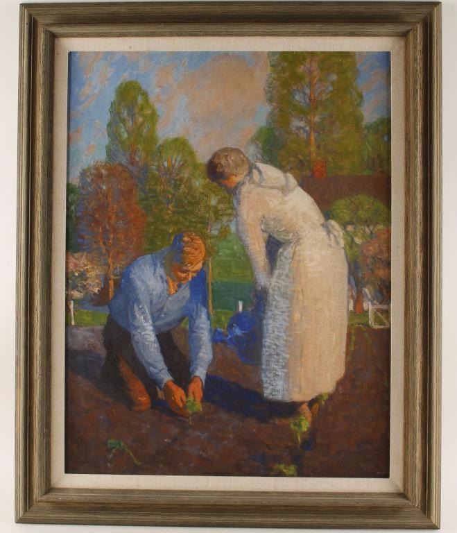 by Pitt Loofbourrow Fitzgerald was active/lived in Ohio. Pitt Fitzgerald is known for illustrator, western genre during the early 20th century. Depicting Farmers sowing seeds in field. However it is unsigned and we believe this to be his work as per our consignor and is listed on the artist's website as one of his works. Image size is 23X20.