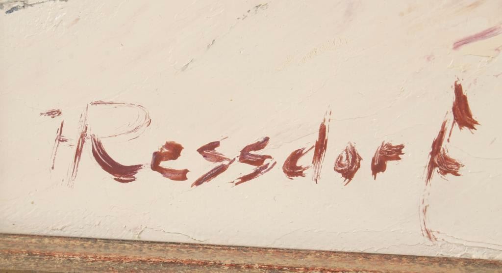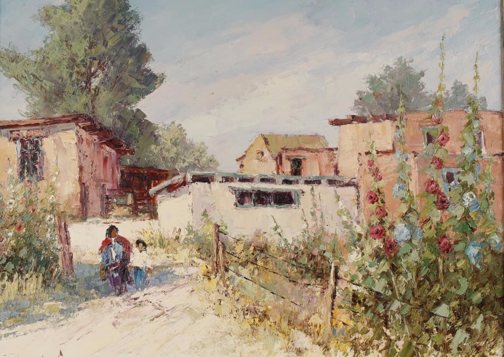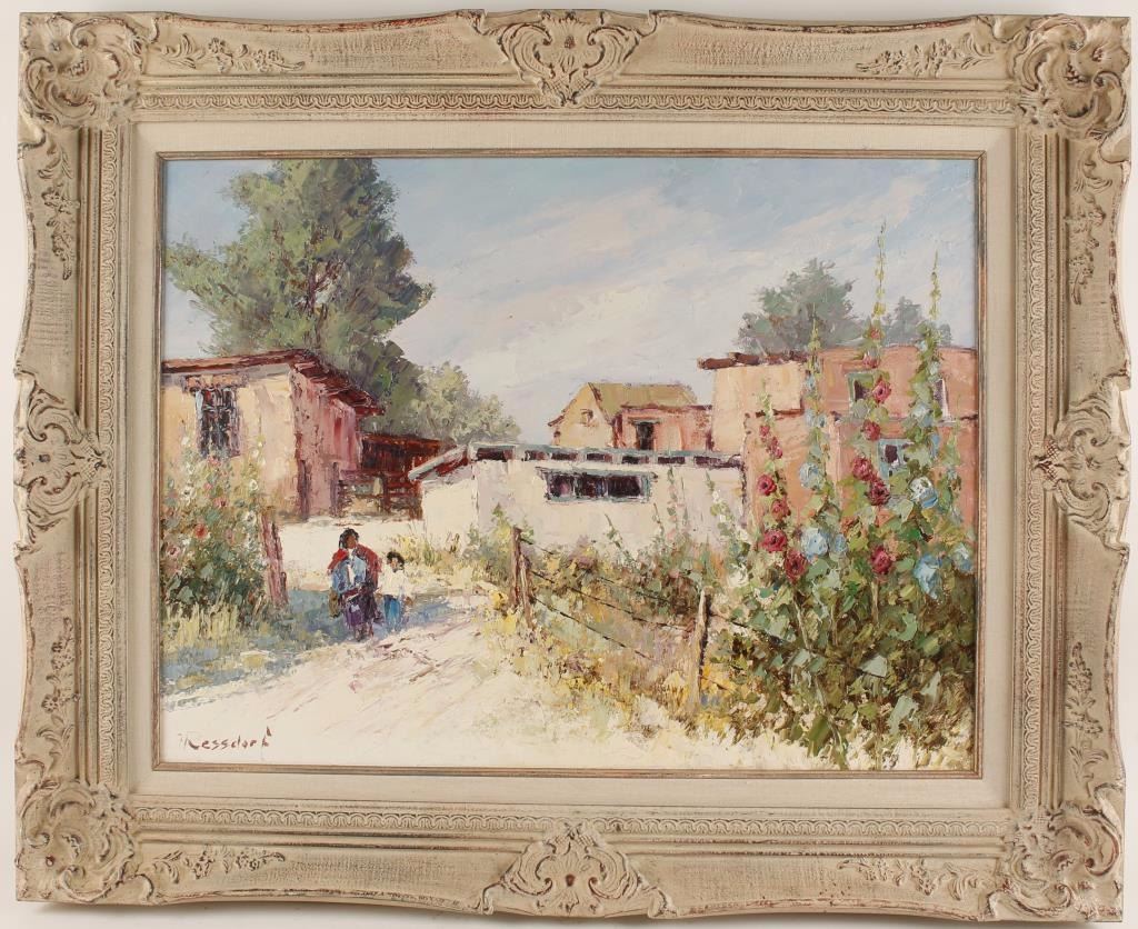 by noted impressionist artist Hans Ressdorf. Depicting an indian village with a beautiful foreground of hollyhocks. Image size 23X17 signed lower left hand corner. Born in Germany, Hans Ressdorf became a painter of Impressionist landscapes, still lifes, and architecture native to the state of Arizona, where he settled in Tucson. He emigrated to the United States in 1918, and from 1978, has been a full-time painter. In Germany, he studied with Impressionists Paul Dalen and G. Martin and during World War II as a conscripted German soldier, was exposed to French artists when he was stationed in Paris.