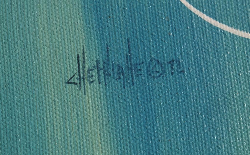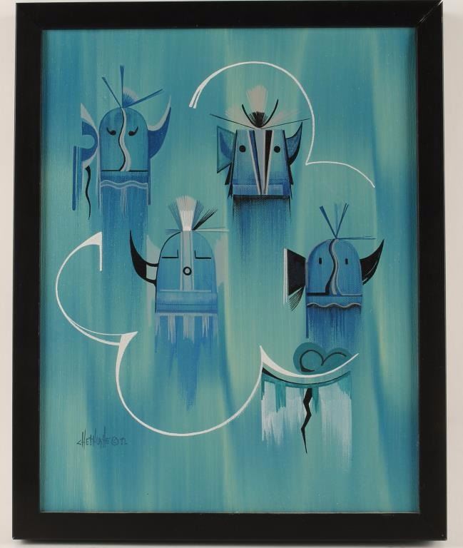 by Paladin Chethlahe.Image size is10X12. Depicting Kachina Spirits with a very blue background. Paladin Chethlahe is active/lives in United States. Paladin Chethlahe is known for Native American paintings. David Chethlahe Paladin [1926-1984] was born on the Navajo Reservation in 1926 at Canyon de Chelly, Arizona. He passed away in Albuquerque, New Mexico in 1984. He had served in the U. S. Army during WW II and was a prisoner of war for 2-1/2 years. He studied art at Santa Fe and at the California School of Fine Arts. He studied under Marc Chagall and Mark Tobey. "Paladin gave credit to the influence of Mark Tobey, Morris Graves, and Marc Chagall for influencing him to abandon his early traditional style of painting and embark on a more contemporary style. While still a student, Paladin met Marc Chagall at an exhibition of the artist's work at the Chicago Art Institute. Chagall encouraged him to use his Navajo heritage but not to illustrate anything; instead he should listen to the story, dream it, and paint it. The influence of Mark Tobey and Morris Graves, whom he met in Portland, Oregon, led him to experiment with texture, mixing clay, sand, and mud, and adding them to his paintings." Arizona Arts and Lifestyle, spring 1980.