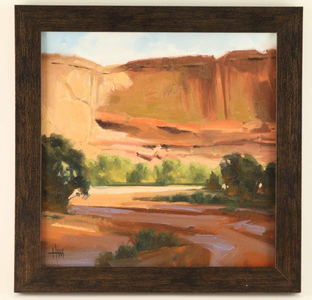 by Tom Hass entitled Walls of Echo measures 11.5"x11.5" Bio- Painter Tom Haas offers views of the American landscape, particularly the Southwest. Sometimes other subjects appear in his work such as small towns or early pueblo life to ranches and animals. His brush strokes portray light, form, color and atmosphere in addition to allowing the viewer to see the process of painting. He often works en plein aire, a French term for in the open air. The National Park Academy of the Arts recognized Tom Haas as "being in the top echelon of representational artists working today", with its Award For Excellence in 2002, 2003 and 2004. Home National Bank acquired two paintings by Haas for their offices in Scottsdale, Arizona in 2002. And the year before, MBNA America Bank collected more than 30 paintings by this artist. The U.S. Department of State's regional office in Vienna, Austria, introduced one of Haas' Southwest landscape paintings to a global audience with its 2004 calendar. That painting was, also, published on the cover of the Geneva Art In Embassies catalog and is one of two oils by Haas now on exhibit at The Residence of the U.S. Ambassador to the United Nations, Geneva, Switzerland. As a result, Tom was a guest at The White House, Washington, D.C., in 2004. Tom Haas studied oil painting with many North American painters, such as Duane Bryers, Len Chmiel, William Reese, Mark Daily, George Strickland, Dan Mieduch and James Reynolds, at the Scottsdale Artists School where Haas also became a painting instructor.