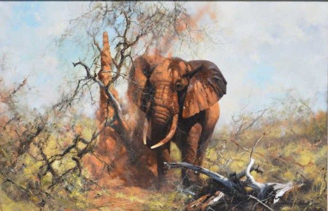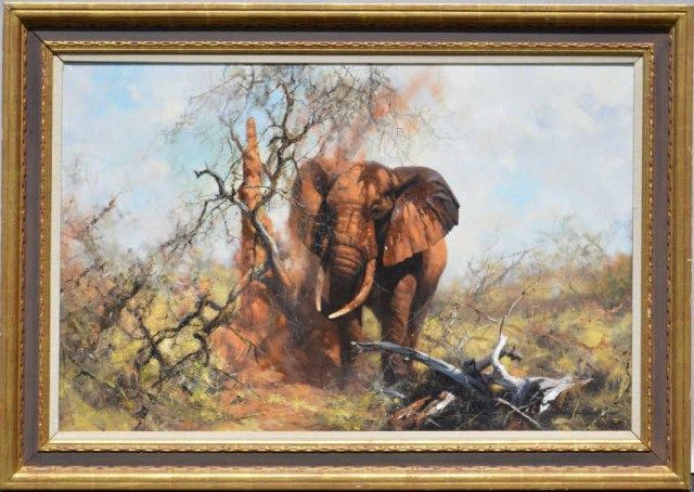Original oil painting of Bull Elephant by world recognized African Wildlife Artist David Sheppard who has recently deceased. The painting measures approx. 29” x 48” not including frame. Major works by DavidSheppard have approached $200,000. This artist is actively collected by individuals and institutions. From the Estate of Robert E. Petersen. Est.; $10,000-$20,000
