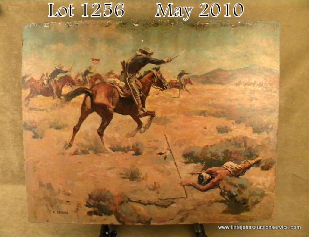 Original oil painting on artist board of Cavalry on the charge with defeated Indian lying in the foreground by R. Crooks. R. Crooks was born in 1925 and was an Otis Art Institute graduate in 1944 and is a popular California artist who worked in Glendale and moved to French Gulch, CA. His popular works have fetched up to $3,500 at auction. Approx. 24" by 30", unframed. Showing significant damage and needing restoration. An older piece needing cleaning and slightly warping. Est: $150 - $300