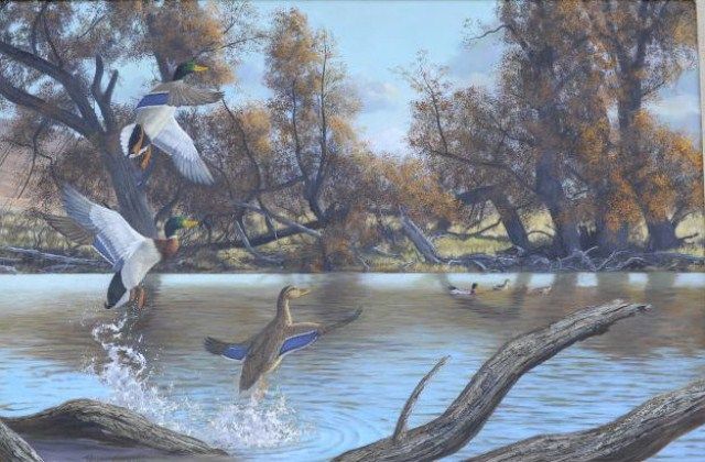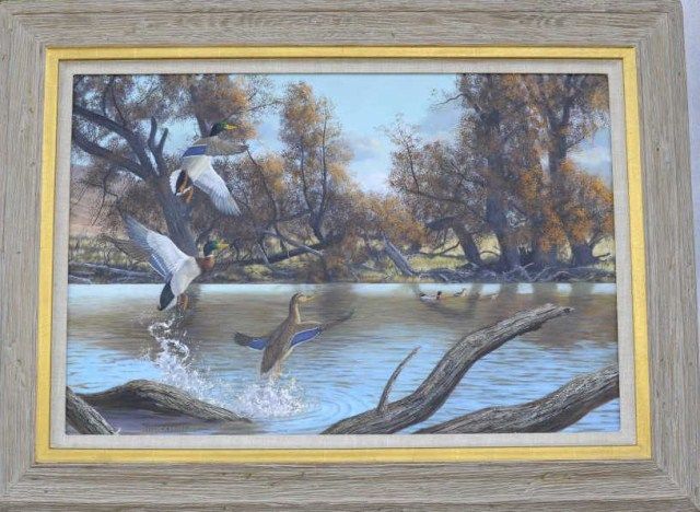 Original oil painting on board signed lower left Russ Johnson. Approximately 24”x36” with no condition problems, nicely framed and matted. Russ Johnson is a well known Wildlife Artist and is one of Robert E. Petersenfavorites for his waterfowl collection. From the Robert E. Petersen Estate. Est.; $1,500-$3,000