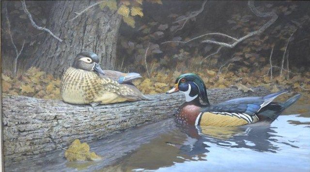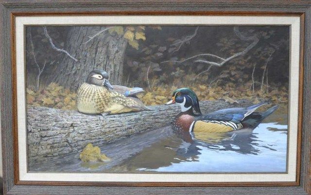Original oil painting on board signed lower left Russ Johnson showing colorful and well detailed ducks courting with pleasing expressions. The painting measures approximately 16”x28” is in excellentcondition with no problems. Nicely framed and matted. Contemporary artist well known to Ducks Unlimited and Conservation Organizations. From the Robert E. Petersen Estate. Est.; $750- $1,500