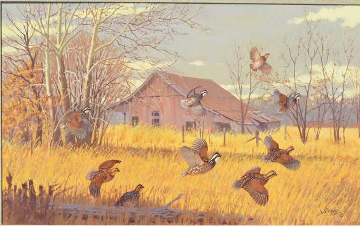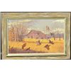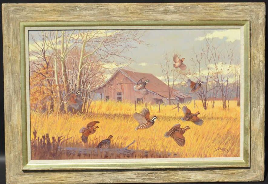 Original oil painting on board signed lower right LeBlanc and shows a flushed Covey of Quail with old ruined barn house or building in background. Approximately 26” x 44”. From the estate of Robert Petersen who activelycollected Lee LeBlanc’s work. Est.: $1,500 -$3,000.