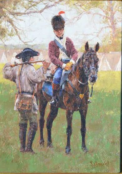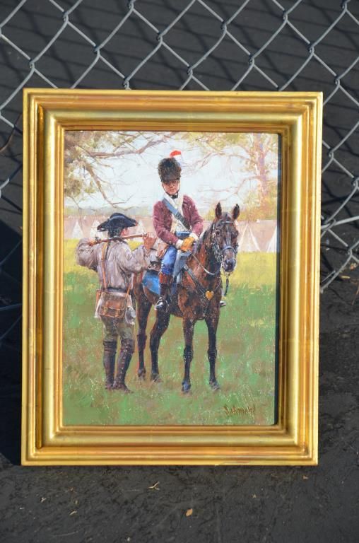 Original oil painting on canvas entitled “Camp Security” signed lower right Schmehl and dated 2009 on back. Brad Schmehl is an excellent artist well-known for his military and revolutionary war scenes. The painting measures 12” x 8 1/2” and is in mint condition showing a Toby of Los Angeles frame. Toby frames are considered the best in the West. Original cost of frame alone over $1000. From the estate of Frank Semmo noted art dealer and old time collector. Est.: $1,000- $3,000.
