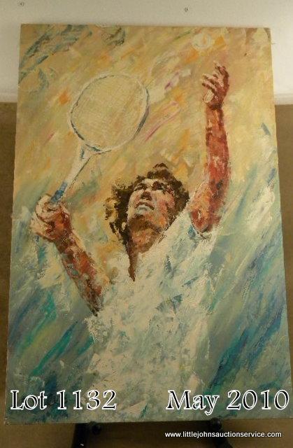 Original oil painting on canvas featuring a tennis play serving, signed E. Vallo in left corner. Measures approx. 36" in height by 24" in width. Colorful and impressionistic, also reminiscent of Leroy Neiman with good technique and brush &pallet knife application using layers of paint. No frame. Est: $150 - $300