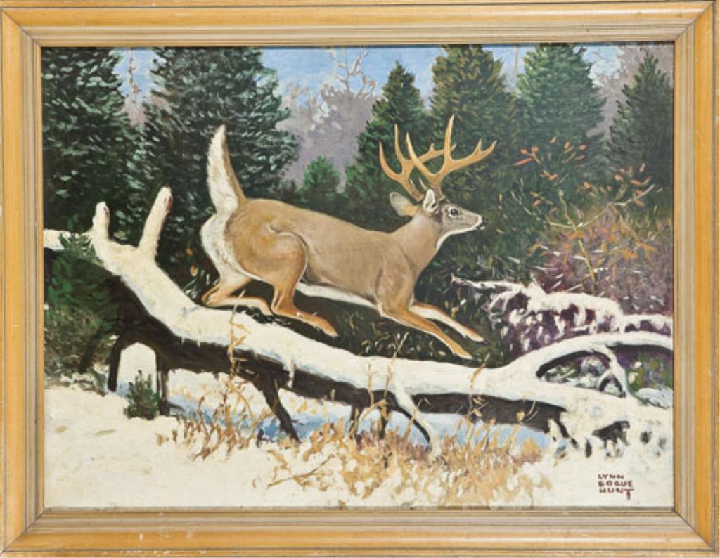 Original oil painting on canvas featuring a young buck jumping over fallen tree in snow (early hunting season) by well noted pre-war artist Lynn Bogue Hunt. Approx. 20”h by 27”w (artwork), showing an old frame. The painting is in very good condition needing some light cleaning only, the frame shows storage marks. Lynn Bogue Hunt was an important artist who was considered one of the best sporting artists of the 20th century. Havingworked for Remington, Winchester, and sporting magazines, Hunt was considered among the best in his time. Mr. Hunt did over 100 illustrations for Sports Afield from 1897 to 1951. His sporting art is some of the mostrecognized ever including duck stamps, over 250 separate cover paintings for 40 different magazines from Boy’s Life to the Saturday Evening Post. Also, he worked for ammunition and gun companies producing advertisements.His popular artwork was earning him the incredible sum of over $50,000 per year during the depression. His studio was located near New York City for more than 57 years and his works are among the most sought after