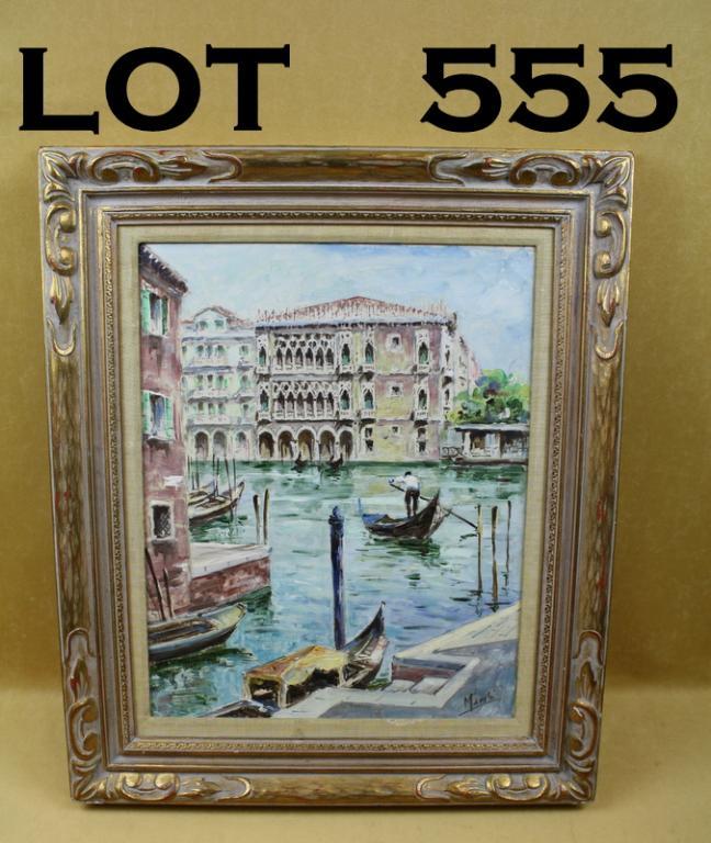 Original oil painting on canvas laid down on artist’s board showing gondolas in Venice. Approx. 22“h by 17-1/2“w. Signed “Marchi” (Mario), lower right. Nicely framed. Mario Marchi is a well-listed Italian artist known for his traditional Italian scenes. Included document shows listings up to $8,288 for a 15”by20”, refer Davenport #1561, 2008. Frame shows label D. Matte, Hand Carved Picture Frames, New York. The painting is in good condition needing only light cleaning and minor conservation. Some slight age checking. Circa approx. mid 19th century. Est: $400 - $800