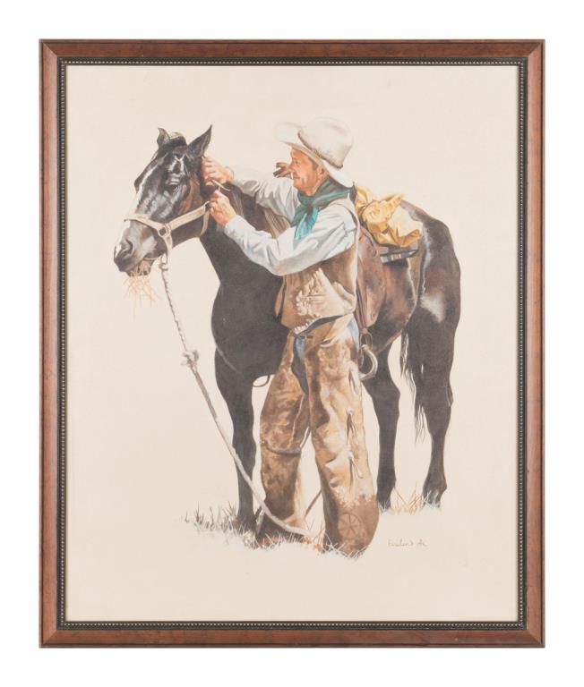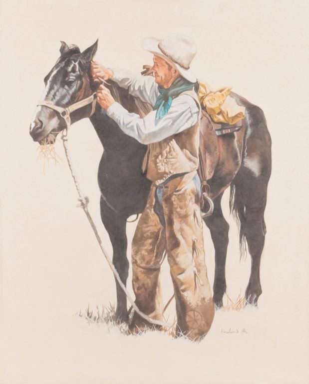 Original oil painting on canvas portraying cowboy wearing chaps with his source signed lower right pool in width his brand for Mark. The artwork measures approximately 31” x 26” is nicely framed there are no condition problems near mint toslightly dusty from storage. Born 1947 - He is known for creating the artwork for the 75th Anniversary of the Buffalo Bill Cody Stampede. His works are shown in Cody, Wyoming and throughout the West. Actress Melanie Griffith is known tohave collected his works. Est.: $3000-$6000