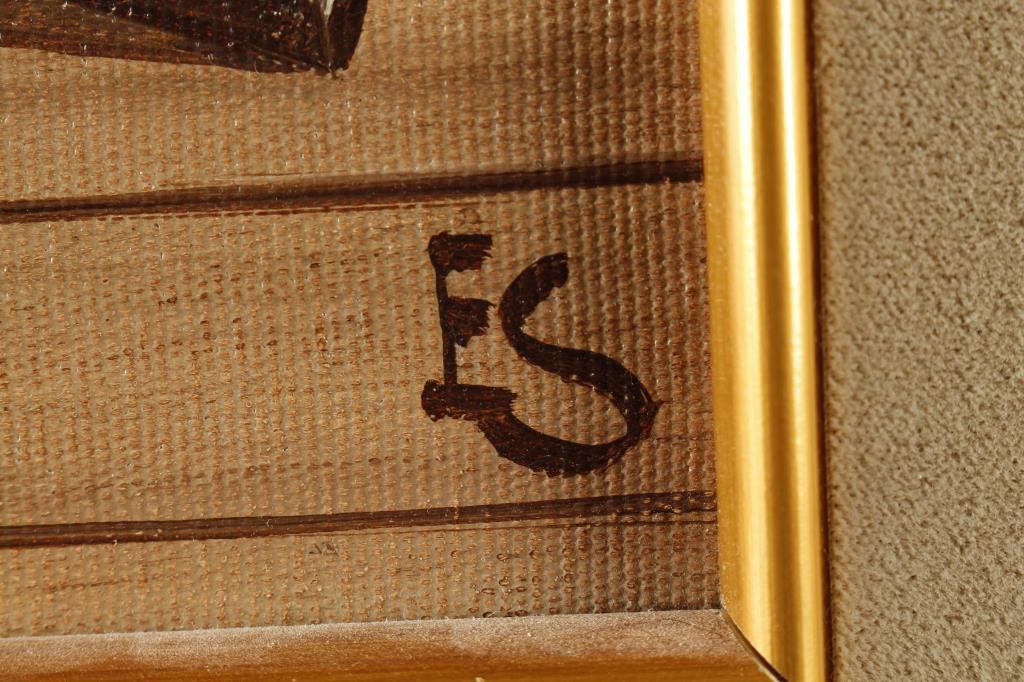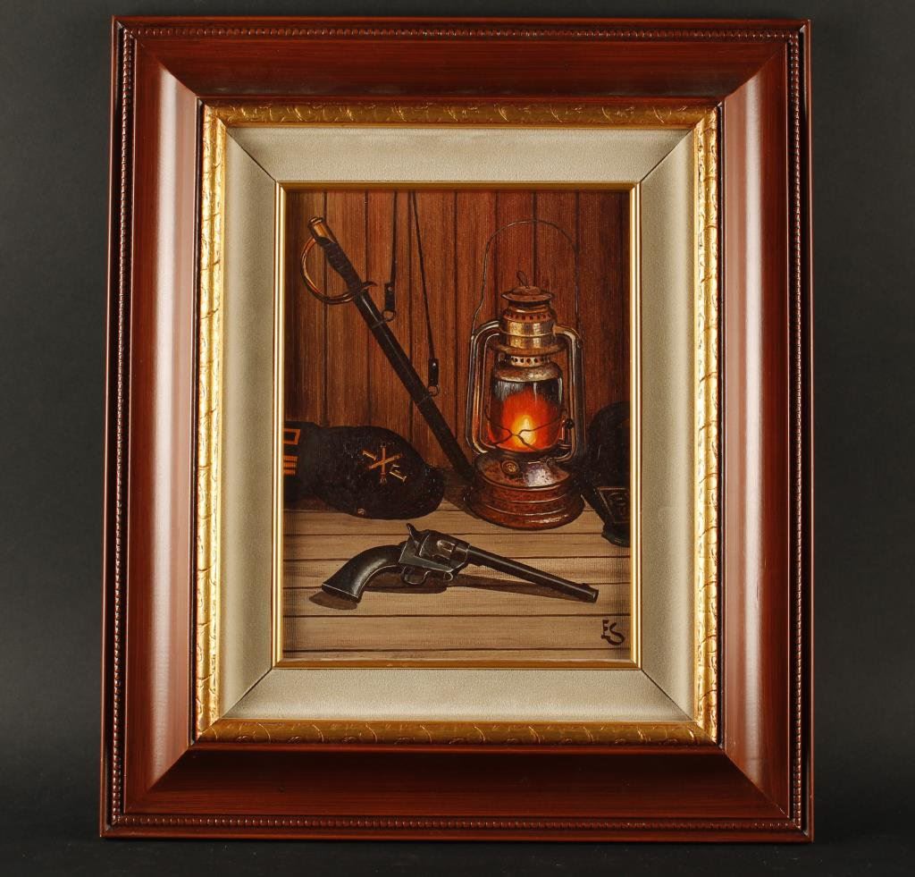 Original oil painting on canvas showing Colt Single Action Army revolver U.S. Calvary model with accoutrements and kerosene lamp lighting the scene. Signed lower right ES for Eugene Schmidt well-recognized contemporary artist whose paintings have been accepted by the Queen of England and used in many promotions for the city of San Antonio and Santa Barbara where he is located. The painting measures approximately 12” x 9” and is nicely framed and matted. Est.: $500-$1,000.