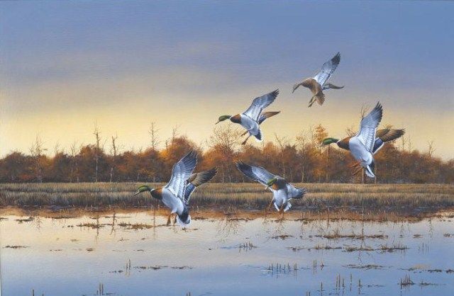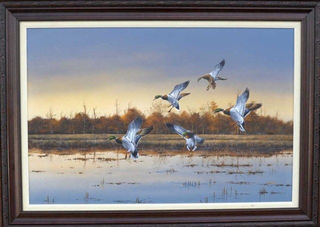Original oil painting on canvas showing landing ducks signed lower right Crowe. Approximately 25”x37” no condition problems, near mint, frame shows a couple of minor nicks. A beautiful rendition by a wellrecognized artist who is known for his detail and colors. This may have been the original for a publication by Petersen. Phillip Crowe was born in 1947 and he remains in the top tier of contemporary Wildlife Artists. Fromthe Robert E. Petersen Estate. Est.; $1,500-$3,000