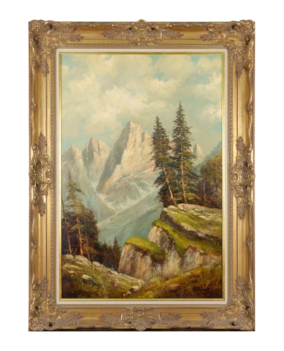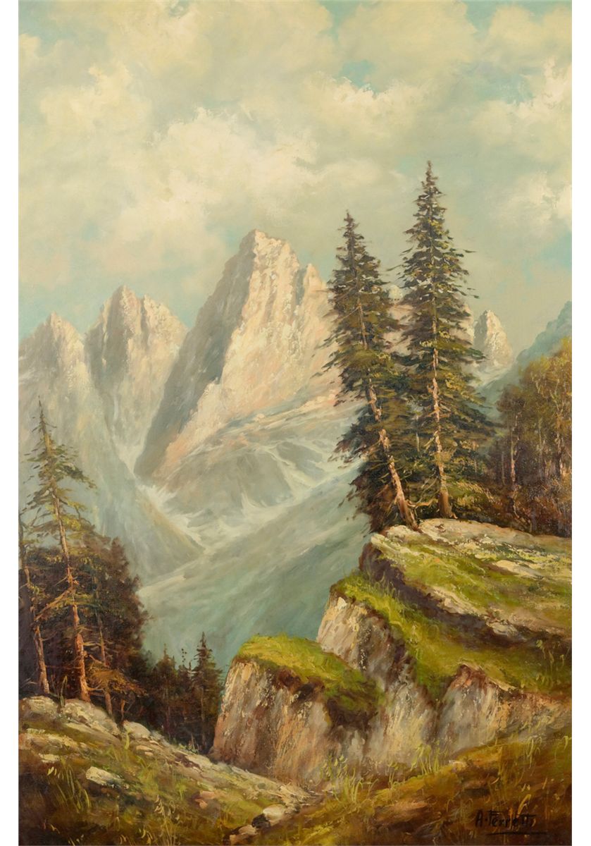 Original oil painting on canvas showing mountain scene. Signed lower right A. Ferretti and measures approximately 35 ½”x 23 ¼”. In quality Belgium marked frame. From a local estate. Could be northern California. Est.: $150-$300