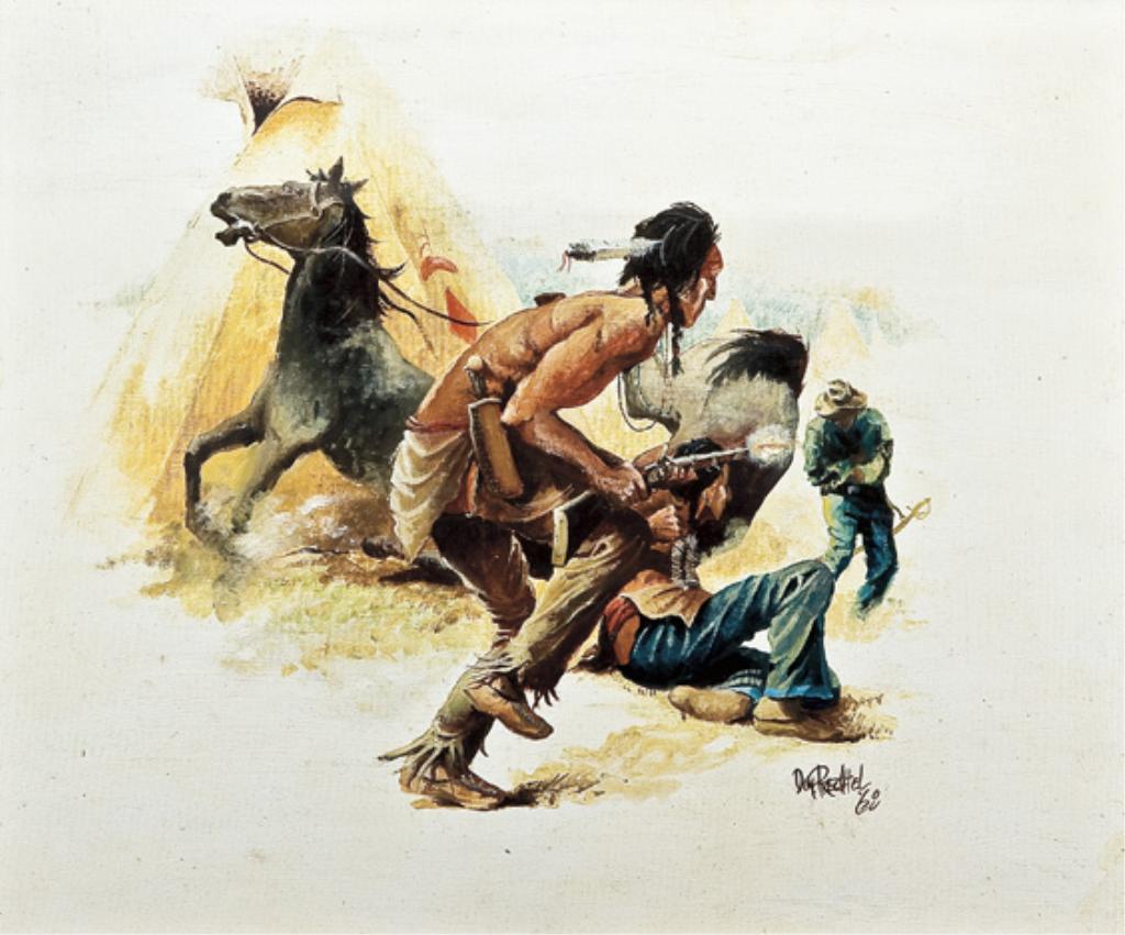 Original oil painting on canvas showing rampaging Indian braves signed Don Prechtel dated 1968, approximately 20” high by 24” wide, nicely framed and matted. Needs some slight cleaning and minor conservation. Don Prechtel is one of the Northwest’s most recognized artists who is well known for his Civil War scenes and western depictions and is recognized throughout the United States. His work is housed in many prominent collections and museums. Est.: $1,500-$3,000.
