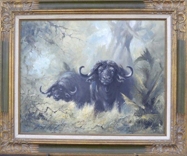 Original oil painting on canvas signed lower left Doug Van Howd portraying two (2) Cape buffalo in African setting. The painting measures 22”x28” nicely framed and matted with no condition problems. Doug Van Howd isone of California’s most recognized artists and one of Robert Petersen’s personal favorites. His bronze of the Pony Express Riders was displayed for thirty (30) plus years at the MGM Grand in Reno and was hismost identified work. Est.; $2,500-$5,000 Note: this artist won many awards at the Safari Club Conventions and Events.