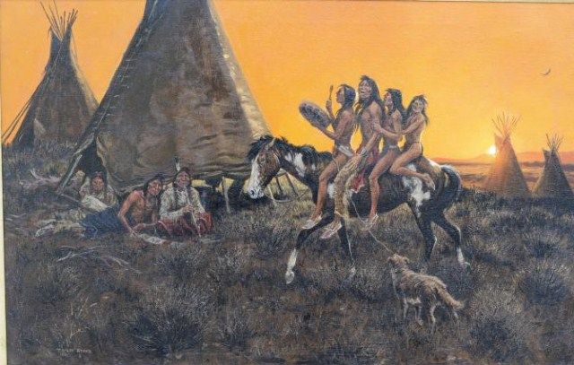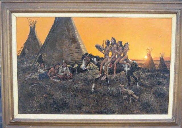 Original oil painting on canvas signed lower left Ernest Berke dated 1961 entitled on sticker attached to reverse “Evening Serenade”. The whimsical painting shows four (4) Indians on horseback singing to theirfriends in teepees with dog in foreground (firewater may have been involved). The painting measures approximately 21-1/2” painting shows some bubbling, impressions and small spots of an unknown substance. Needscleaning and conservation (estimate less than $300). Ernie Berke was well known for his bronzes and this is the only painting we have found by him. Petersen Galleries handled his work in Beverly Hills during the 1960’s andRobert Petersen kept this example for his personal collection. From the Robert E. Petersen Estate. Est.; $900-$1,800