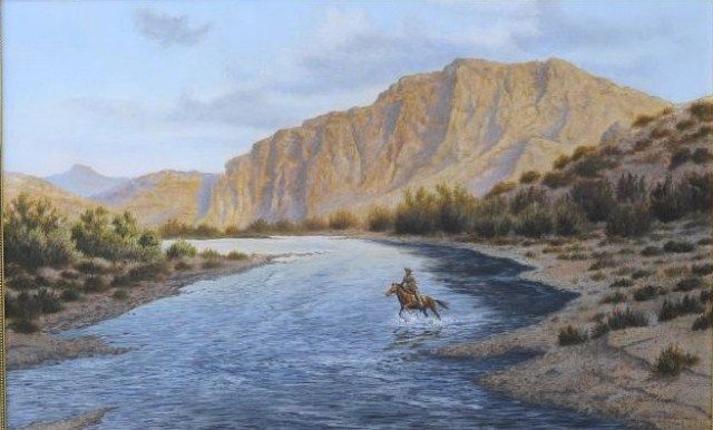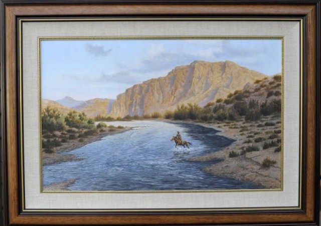 Original oil painting on canvas signed lower right David Chapple. The painting shows a rider in Western garb crossing a river. The painting is very finely detailed. David Chapple is mostly known for his Wildlife butoccasionally we see a Western subject. The painting measures approx. 17”x27-1/4” condition is excellent to mint. Est.; $1,250- $2,500