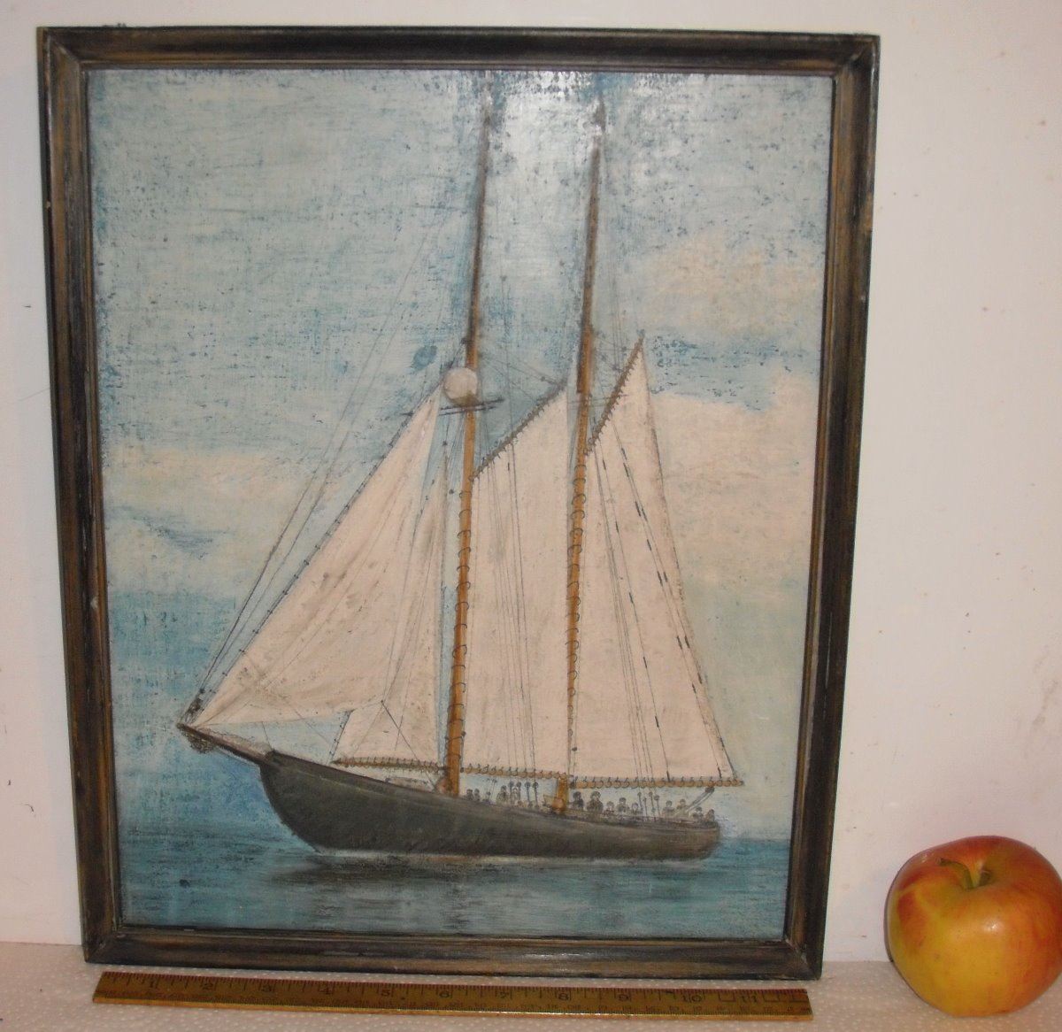 Original very old painting of sailboat by artist drawer and painter "DaveMartinTrainBox", is this study, pour the cottage, cabine or house,