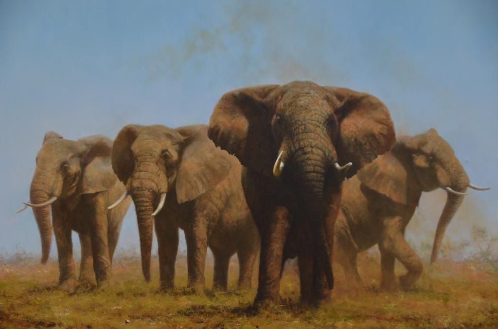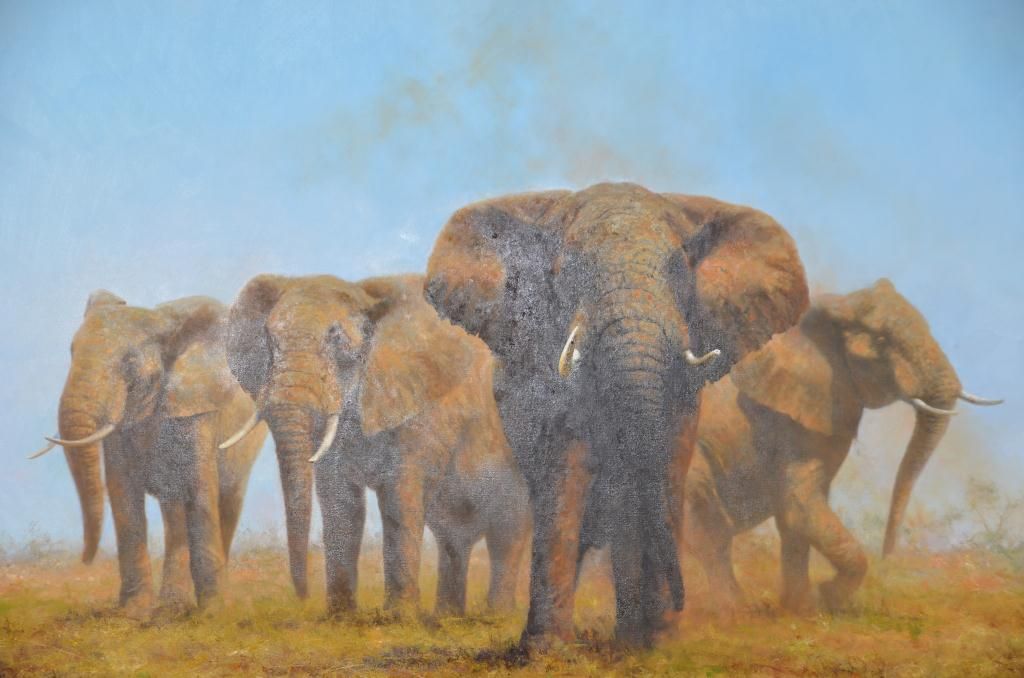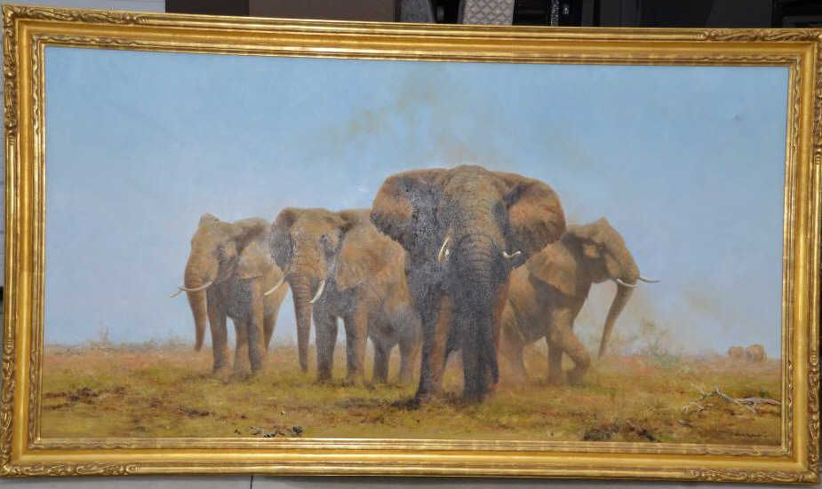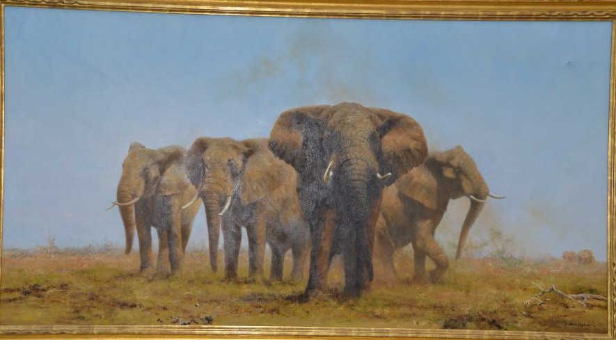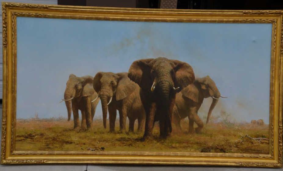 Original painting on canvas signed lower right David Shepherd. This major oil painting measures approximately 84” in width by 45” in height and was considered by Robert Petersen to be one of the finest Africanwildlife paintings he was able to find and purchase in nearly 50 years of collecting. David Shepherd for many decades has been considered by many experts to be the number one painter of African wildlife art in theworld and his artwork had sold for over $100,000 in his lifetime and we could find no record of any this large with as many figures. His paintings are increasing rapidly in value though seldom offered for sale onthe collectors market. A rare opportunity to obtain a major work by this top artist who has written five books on his art and won his first award when he was 8 years old in 1939. Est.: $25,000-$50,000.