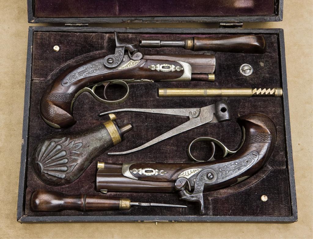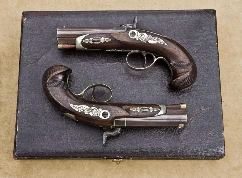 Original pair of cased Henry Deringer percussion pistols with accessories. The pistols measure approx. 7” overall with 3 1/4” barrels of approx. .45 cal., rifled with seven-grooved barrels. The pistols remain in very good condition showing a smooth brown patina finish on barrels with case hardened or satin locks going to grey with traces of their case hardening mixed in and just some light beginning erosion. The stocks are good to very good with some slight edge wear, normal aging and slight carry and a couple of small losses around the area of the tang but at least very good overall. The pair show proper “P” proofs and “Deringer” markings at the breech and at rear portions of the locks and all correct Deringer styling with engraved German silver mounts, pineapple finials and typical Deringer engraved side plates. Both pistols retain brass-tipped correct style ramrods and are in nice, untouched original condition. The pair are contained in their original-to-the-period purple velveteen-lined case which is slightly faded showing some minor fraying and impressions but is at least very good with correct nipple wrench, original correct mold, brass rod, American flask with traces of lacquer, screwdriver and both original compartment covers. The exterior of the box is covered with typical black Moroccan leather with some small cracks and slight losses at the edges but good to very good overall and absolutely the original case to this pair of correct Henry Deringers. With original DuPont inventory sheet stating purchase from Tom Wibberly, 4/15/1981. Est: $9,000 - $18,000