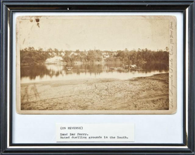 Original photograph mounted on card in sepia tone, approx. 8-1/2” by 5-1/8”, inscribed on one end The August Photo Co, 702 Broad St, shows the Sandbar Ferry, noted dueling grounds in the South. Circa turn of century or before. Image in good condition with some spotting, slight staining, normal aging. From the William R. Orbelo Collection. Est: $250 - $500