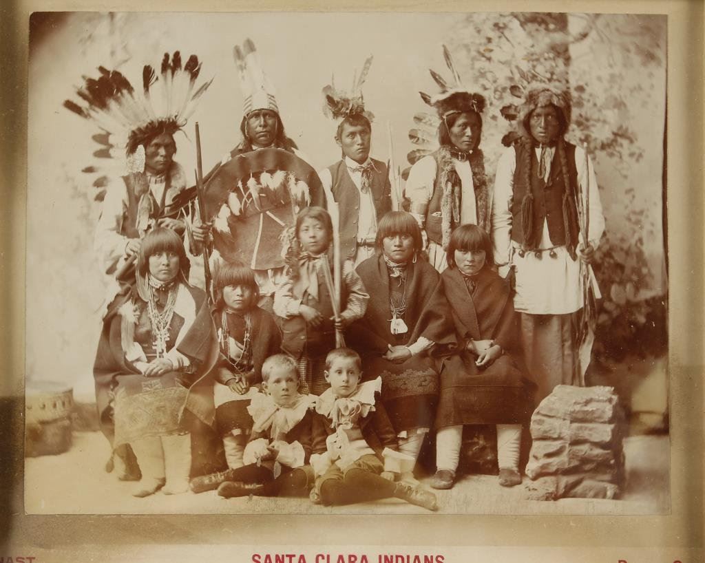 Original photograph of Santa Clara Indians at or shortly after the turn-of-the-century showing two young white boys in the foreground wearing their Sunday best. The image measures 6 1/2” x 8” and the card surrounding the photograph shows the title at center, Denver, Colorado in right corner and the last four letters of the photographers name in the left corner which reads, “??Nast”. The image remains in very good condition and is beautifully framed and matted is why we did not tear off the back to read the name. Est.: $750-$1,500.