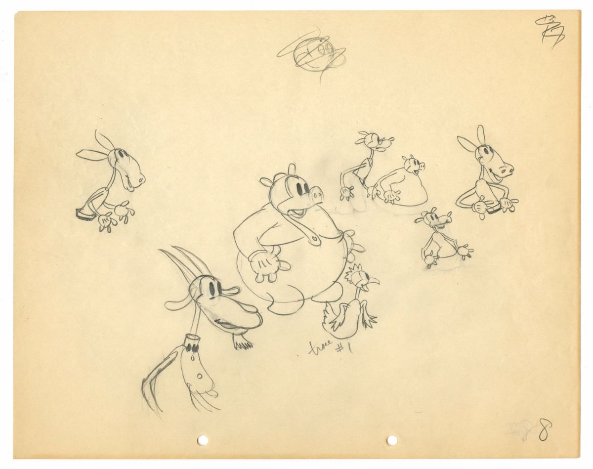 (Walt Disney Studios, 1932) Original production drawing from "The Whoopee Party". Accomplished in graphite on untrimmed 9.5"x12" animation paper. Image size is 6"x9.5". In very good condition with minimal edge-wear.