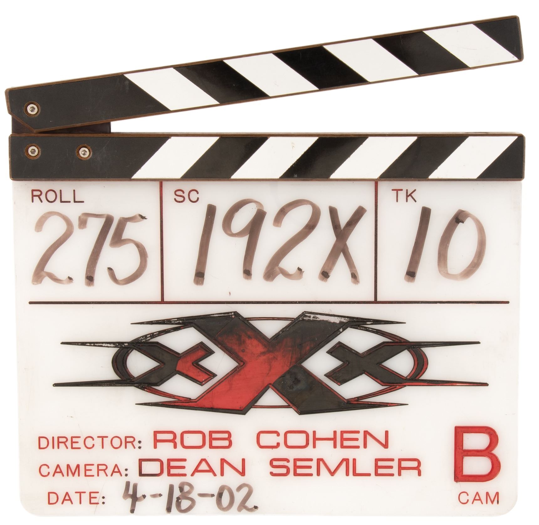 512. Original production used First Unit clapperboard for XXX. (Columbia, 2002) Original plexiglas clapperboard with traditional hinged wooden clapstick present on top with signature black-gray-and-white interleaved diagonal lines. Measuring 11 x 9.5 in. engraved, "Roll, SC, TK, XXX, Director: Rob Cohen, Camera: Dean Semler, B Cam, and Date" on the body of the slate and handwritten in dry erase pen, "275, 192X, 10, and 4-18-02". In production used very good condition. $400 - $600