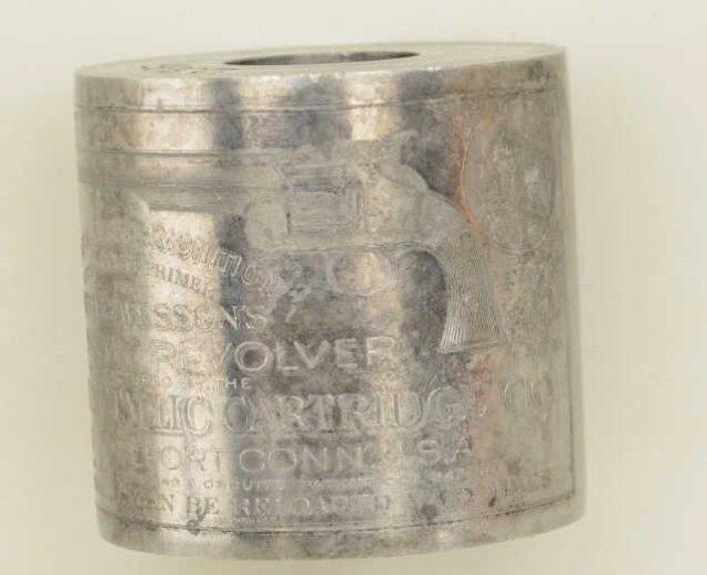 Original roll dye by American Bank Note Company for printing labels on cartridge boxes. The art work shows single-action Smith & Wesson new model revolver. The dye is numbered “2395” the artwork is exceptionaland shows small engraved panels in each upper corner. One with S & W logo and one with grizzly bear, dated 1871. Interesting to both S&W and cartridge collectors, would be great to reprint on stationary. Est.;$400-$800.