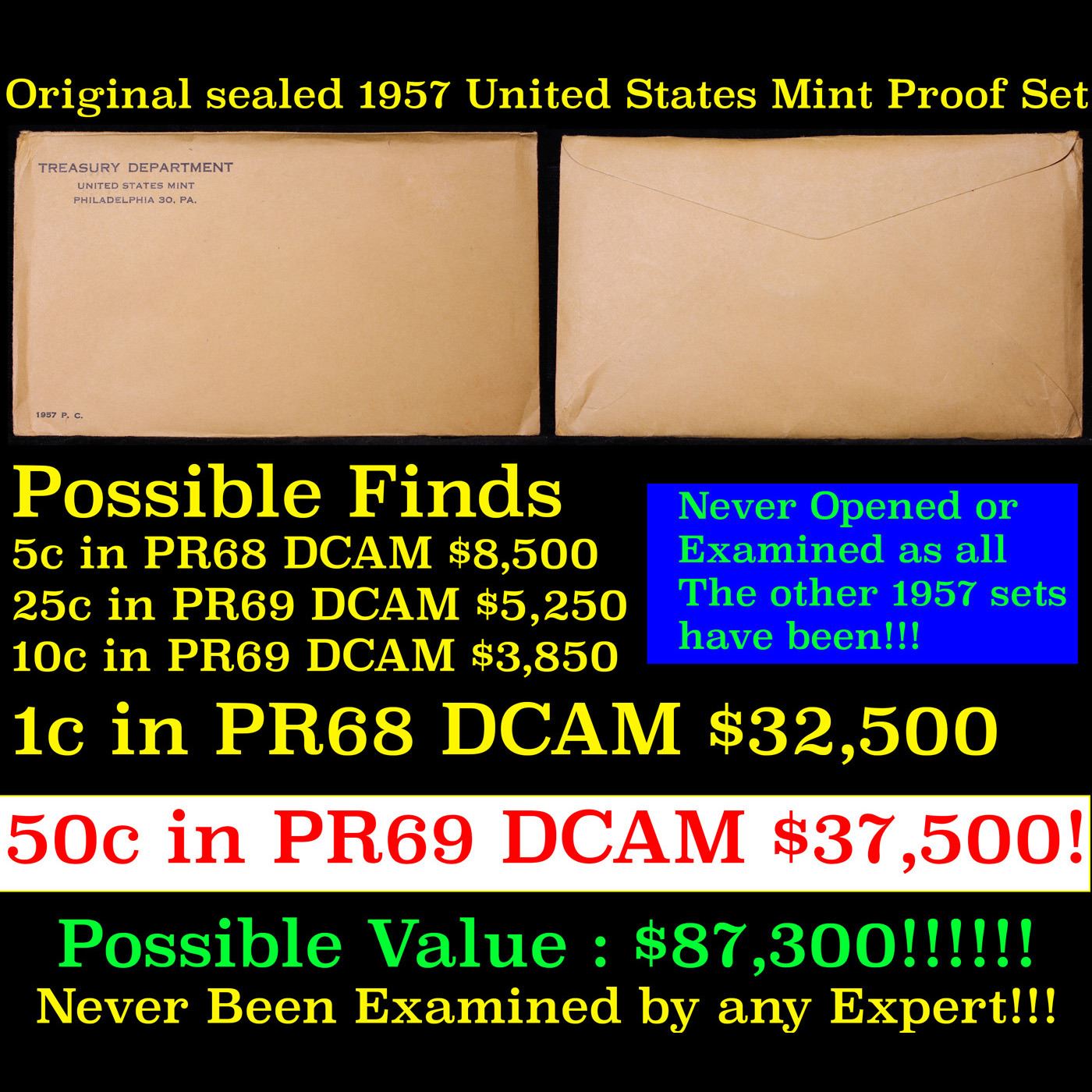 Original sealed 1957 United States Mint Proof Set. Up for Auction is an Unopened 1957 Proof Set In Original Envelope! The Proof set in this Envelope has never been reviewed or examined by anyone. Virtually every 1957 Proof Set has been looked at by Coin Experts who have identified potential PR69 DCAM Coins and had them slabbed. Those opened Proof Sets you find at coin shows or for sale individually have almost certainly been examined and reviewed., So, What COULD be in This Set, Well here are the 5 things that could be inside A Franklin 50c in PR69 DCAM Trending $37,500, a Washington 25c in PR69 DCAM Trending $5,250, a Roosevelt Dime in PR69 DCAM Trending $3,850, BUT That’s Just the Start, There also could be a Jefferson 5c in PR68 DCAM, TRENDING 8,500, BUT EVEN THAT IS JUST THE SIDESHOW! The REAL WINNER IN THIS LOTTERY BOX IS The Lincoln Penny, a 1957 PROOF Lincoln 1c in PR68 DCAM TRENDS $32,500 This could be one of the very last Sealed Envelopes in EXISTENCE. This “WONKA” Box could Contain Coins Worth $87,300 - Good Luck in Obtaining This Unopened 1957 Proof Set!!!