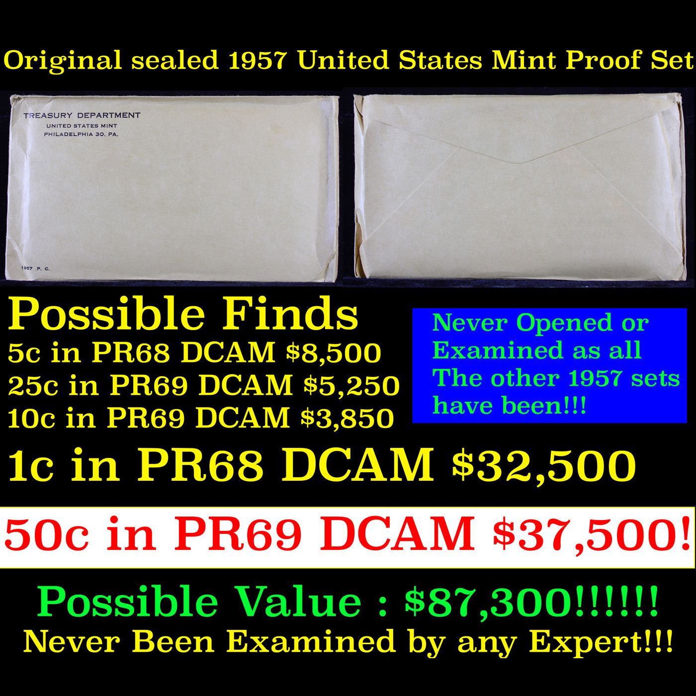 Original sealed 1957 United States Mint Proof Set. Up for Auction is an Unopened 1957 Proof Set In Original Envelope! The Proof set in this Envelope has never been reviewed or examined by anyone. Virtually every 1957 Proof Set has been looked at by Coin Experts who have identified potential PR69 DCAM Coins and had them slabbed. Those opened Proof Sets you find at coin shows or for sale individually have almost certainly been examined and reviewed., So, What COULD be in This Set, Well here are the 5 things that could be inside A Franklin 50c in PR69 DCAM Trending $37,500, a Washington 25c in PR69 DCAM Trending $5,250, a Roosevelt Dime in PR69 DCAM Trending $3,850, BUT That’s Just the Start, There also could be a Jefferson 5c in PR68 DCAM, TRENDING 8,500, BUT EVEN THAT IS JUST THE SIDESHOW! The REAL WINNER IN THIS LOTTERY BOX IS The Lincoln Penny, a 1957 PROOF Lincoln 1c in PR68 DCAM TRENDS $32,500 This could be one of the very last Sealed Envelopes in EXISTENCE. This “WONKA” Box could Contain Coins Worth $87,300 - Good Luck in Obtaining This Unopened 1957 Proof Set!!!