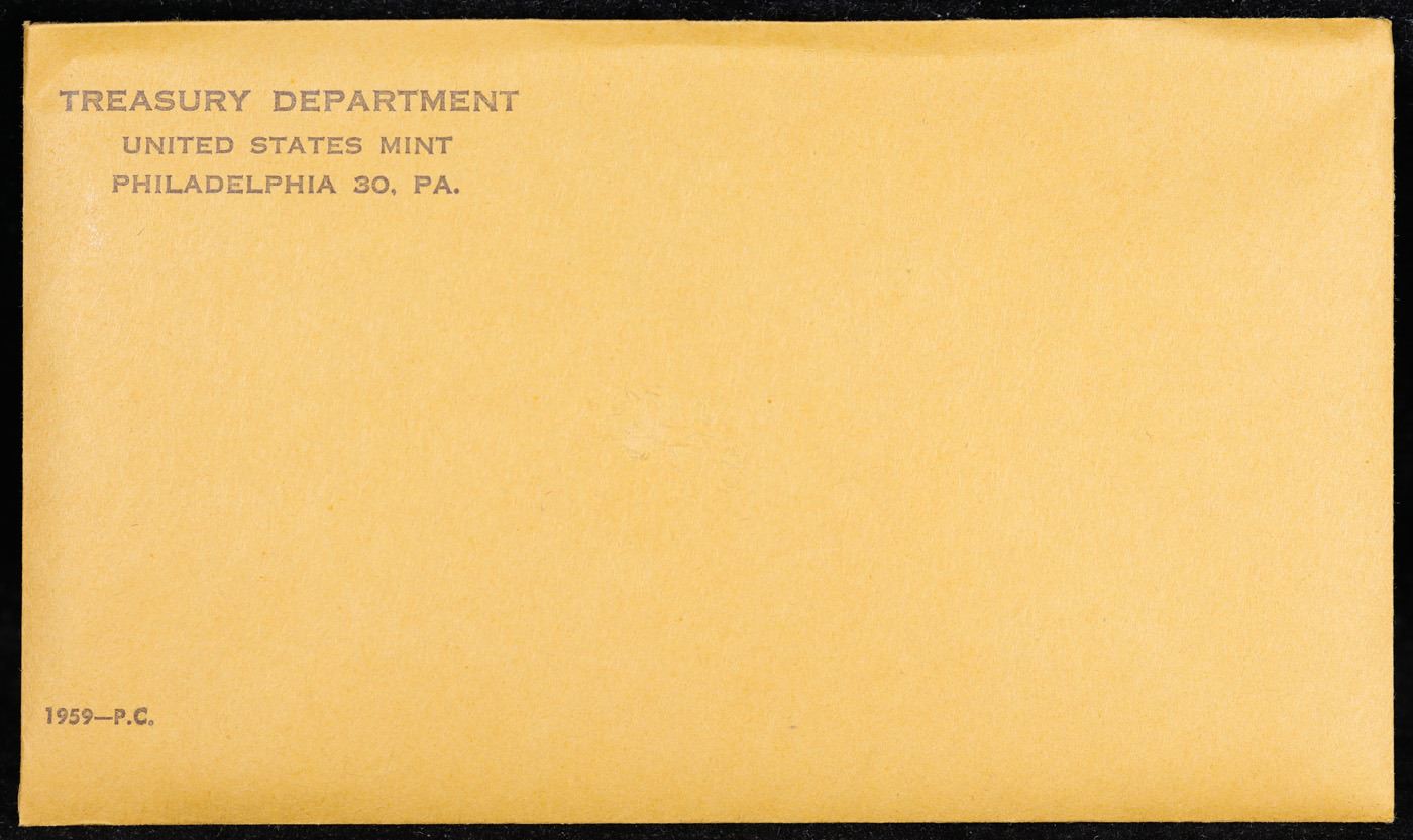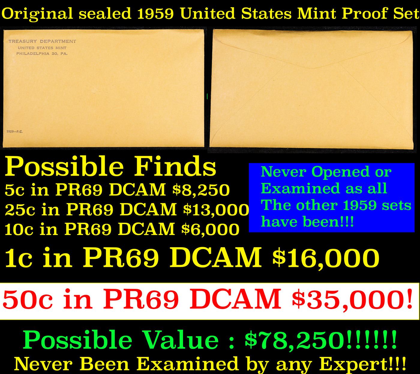 Original sealed 1959 United States Mint Proof Set! 5 Coins Inside!. Up for Auction is an Unopened 1959 Proof Set In Original Envelope! The Proof set in this Envelope has never been reviewed or examined by anyone. Virtually every 1959 Proof Set has been looked at by Coin Experts who have identified potential PR69 DCAM Coins and had them slabbed. Those opened Proof Sets you find at coin shows or for sale individually have almost certainly been examined and reviewed., So, What COULD be in This Set, Well here are the 5 things that could be inside A Franklin 50c in PR69 DCAM Trending $35,000, a Washington 25c in PR69 DCAM Trending $13,000, a Roosevelt Dime in PR69 DCAM Trending $6,000, BUT That’s Just the Start, There also could be a Jefferson 5c in PR69 DCAM, TRENDING 8,250, BUT EVEN THAT IS JUST THE SIDESHOW! The REAL WINNER IN THIS LOTTERY BOX IS The Lincoln Penny, a 1959 PROOF Lincoln 1c in PR69 DCAM TRENDS $16,000 This could be one of the very last Sealed Envelopes in EXISTENCE. This “WONKA” Box could Contain Coins Worth $78,250 - Good Luck in Obtaining This Unopened 1959 Proof Set!!!