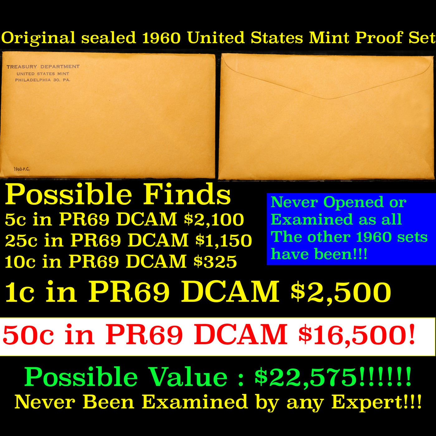 Original sealed 1960 United States Mint Proof Set! 5 Coins Inside!. Up for Auction is an Unopened 1960 Proof Set In Original Envelope! The Proof set in this Envelope has never been reviewed or examined by anyone. Virtually every 1960 Proof Set has been looked at by Coin Experts who have identified potential PR69 DCAM Coins and had them slabbed. Those opened Proof Sets you find at coin shows or for sale individually have almost certainly been examined and reviewed., So, What COULD be in This Set, Well here are the 5 things that could be inside A Franklin 50c in PR69 DCAM Trending $16,500, a Washington 25c in PR69 DCAM Trending $1,150, a Roosevelt Dime in PR69 DCAM Trending $325, BUT That’s Just the Start, There also could be a Jefferson 5c in PR69 DCAM, TRENDING $2,100, BUT EVEN THAT IS JUST THE SIDESHOW! The REAL WINNER IN THIS LOTTERY BOX IS The Lincoln Penny, a 1960 PROOF Lincoln 1c in Large Date PR69 DCAM TRENDS $2,500 This could be one of the very last Sealed Envelopes in EXISTENCE. This “WONKA” Box could Contain Coins Worth $22,575 - Good Luck in Obtaining This Unopened 1960 Proof Set!!!