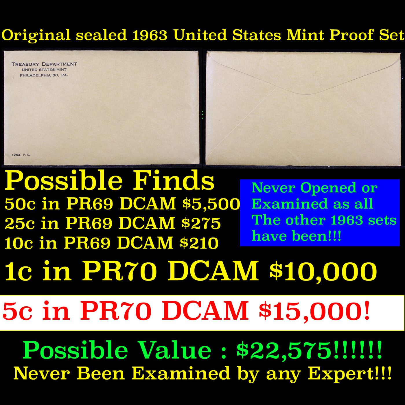 Original sealed 1963 United States Mint Proof Set. Up for Auction is an Unopened 1963 Proof Set In Original Envelope! The Proof set in this Envelope has never been reviewed or examined by anyone. Virtually every 1963 Proof Set has been looked at by Coin Experts who have identified potential PR69 DCAM Coins and had them slabbed. Those opened Proof Sets you find at coin shows or for sale individually have almost certainly been examined and reviewed., So, What COULD be in This Set, Well here are the 5 things that could be inside A Franklin 50c in PR69 DCAM Trending $5,500, a Washington 25c in PR69 DCAM Trending $275, a Roosevelt Dime in PR69 DCAM Trending $210, BUT That’s Just the Start, There also could be a Jefferson 5c in PR70 DCAM, TRENDING $15,000, BUT EVEN THAT IS JUST THE SIDESHOW! The REAL WINNER IN THIS LOTTERY BOX IS The Lincoln Penny, a 1963 PROOF Lincoln 1c in PR70 DCAM TRENDS $10,000 This could be one of the very last Sealed Envelopes in EXISTENCE. This “WONKA” Box could Contain Coins Worth $22,575 - Good Luck in Obtaining This Unopened 1963 Proof Set!!!